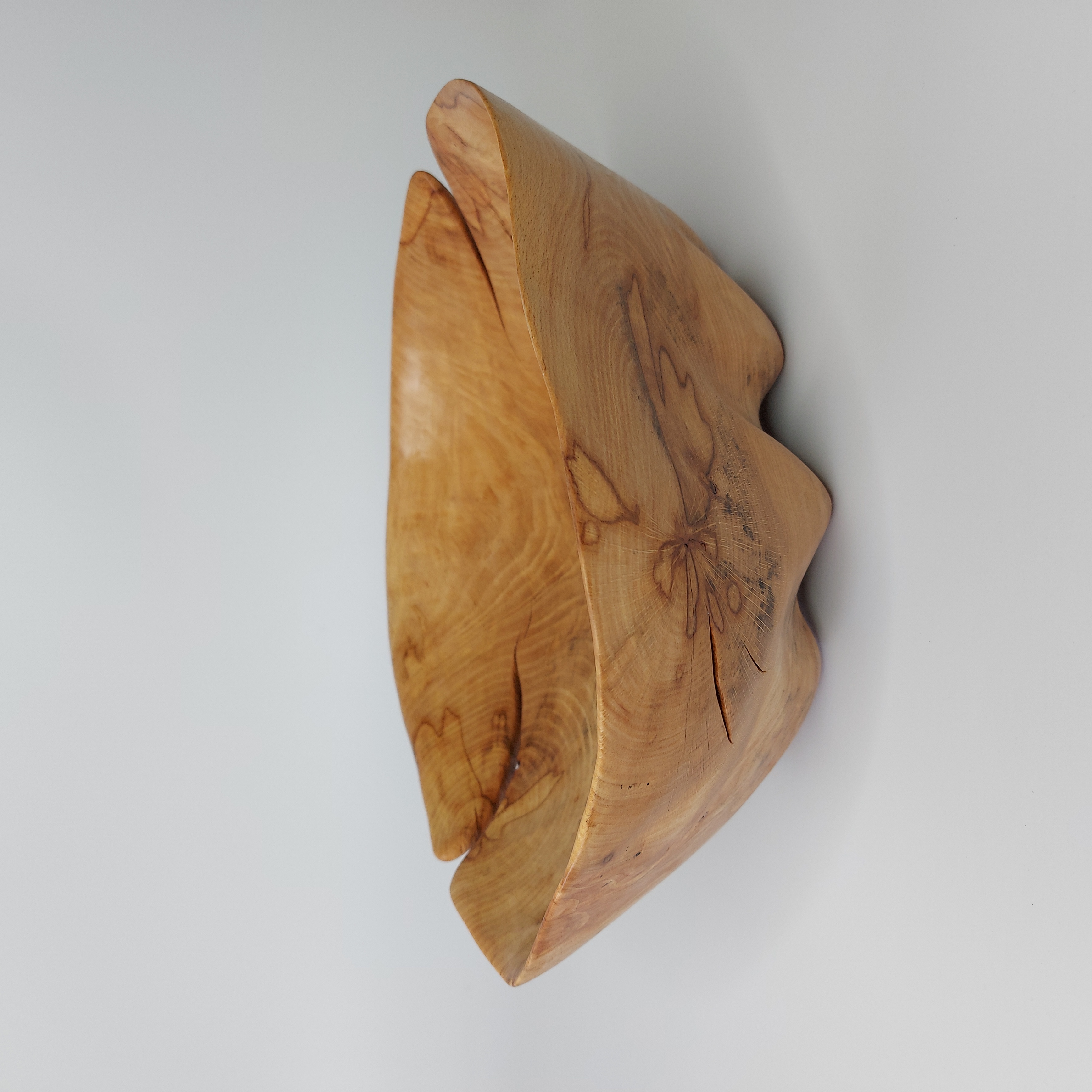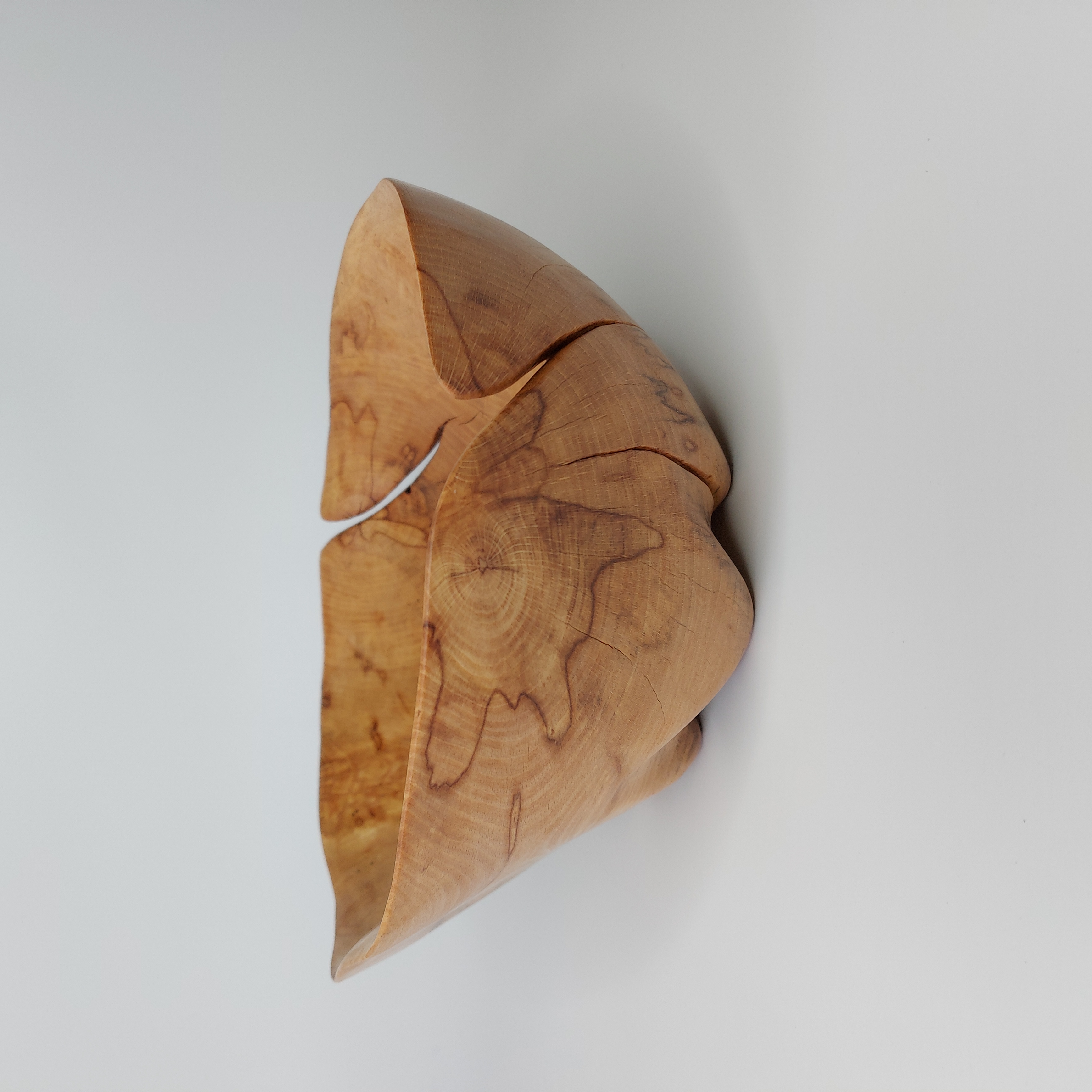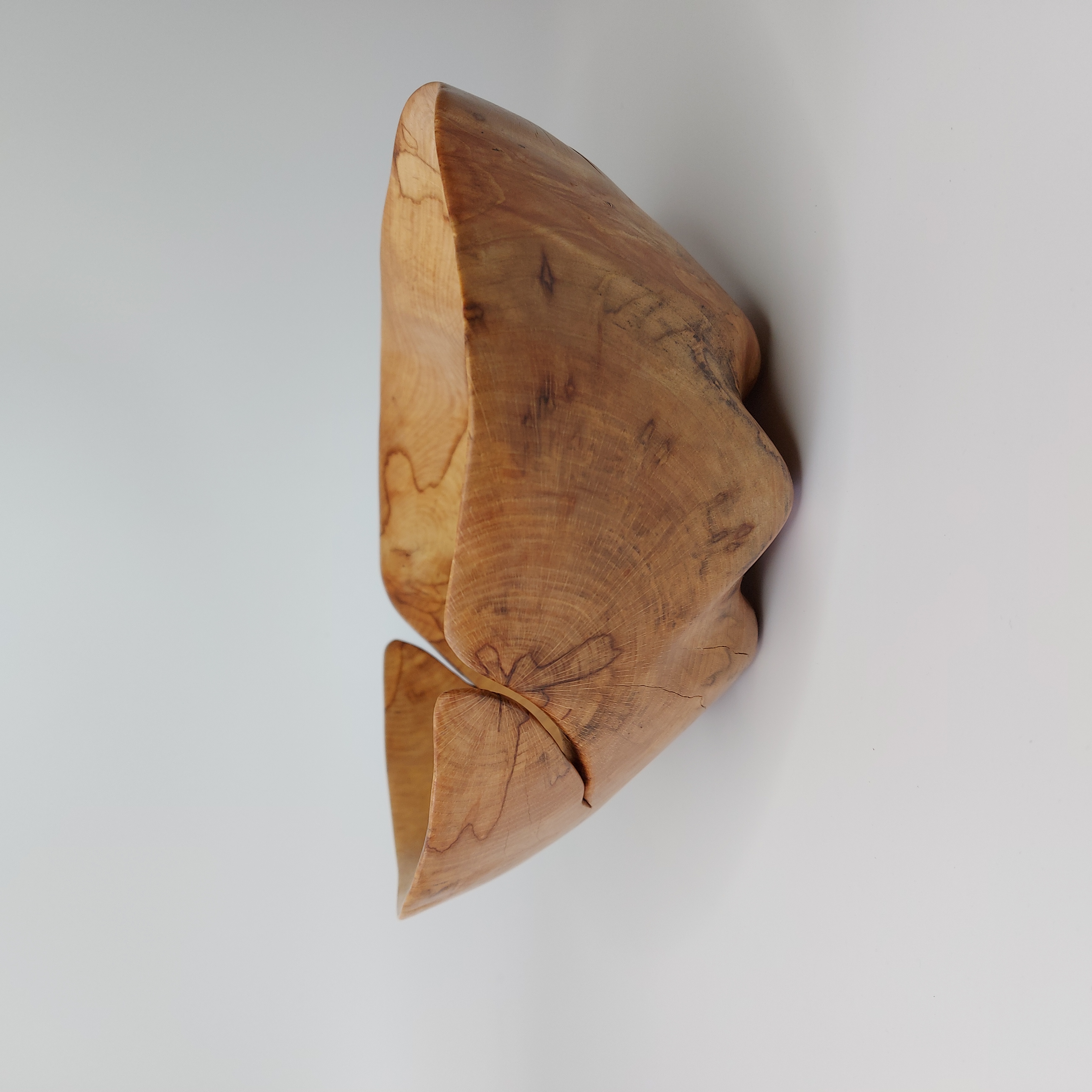 Dlabaná mísa z nalezeného starého odřezku po kácení v lese. Na hotové míse je patrné poškození dřeva způsobené dlouhým působením vlhkosti. Při vysychání nahrubo vydlabané mísy došlo k výraznému praskání, které ve výsledku dodalo míse zajímavý vzhled doplněný výraznými mapami na dřevě.