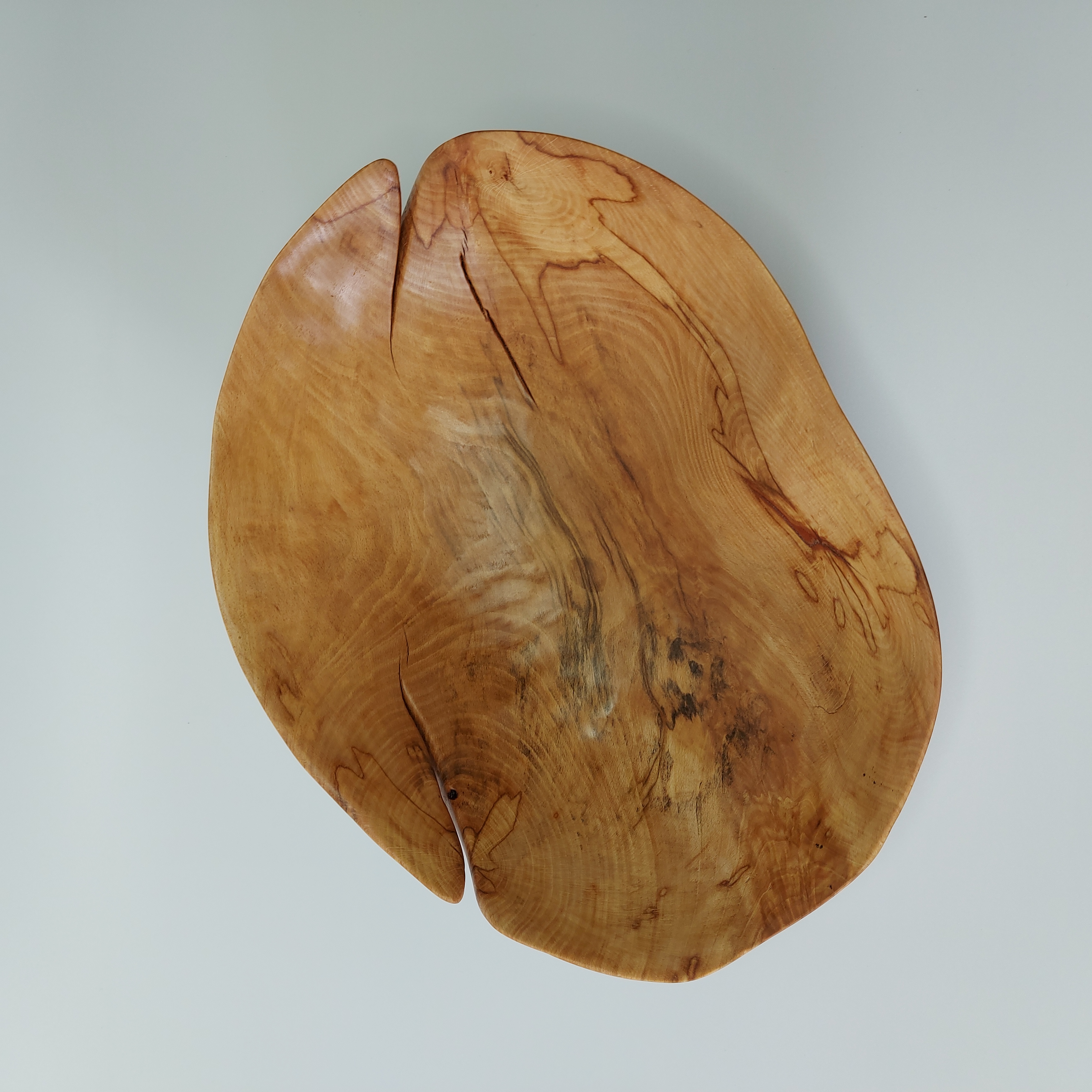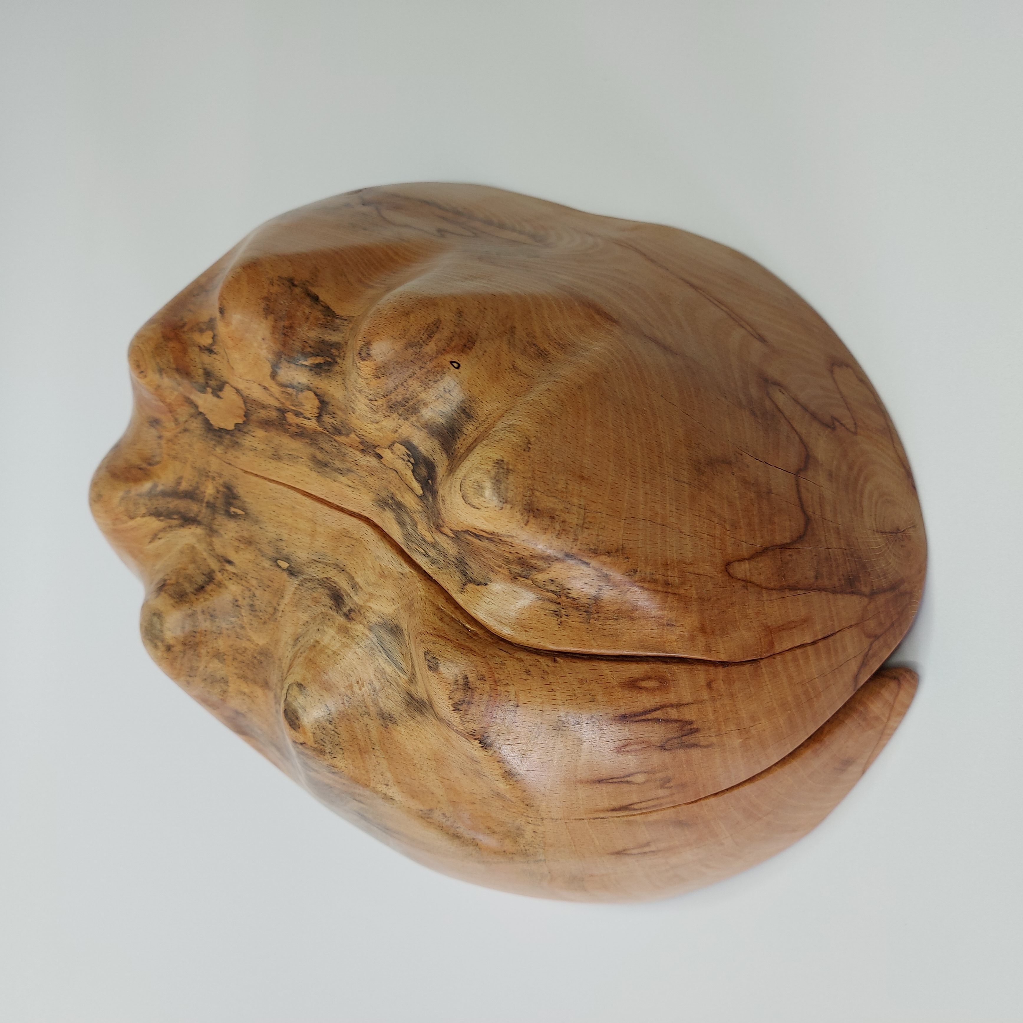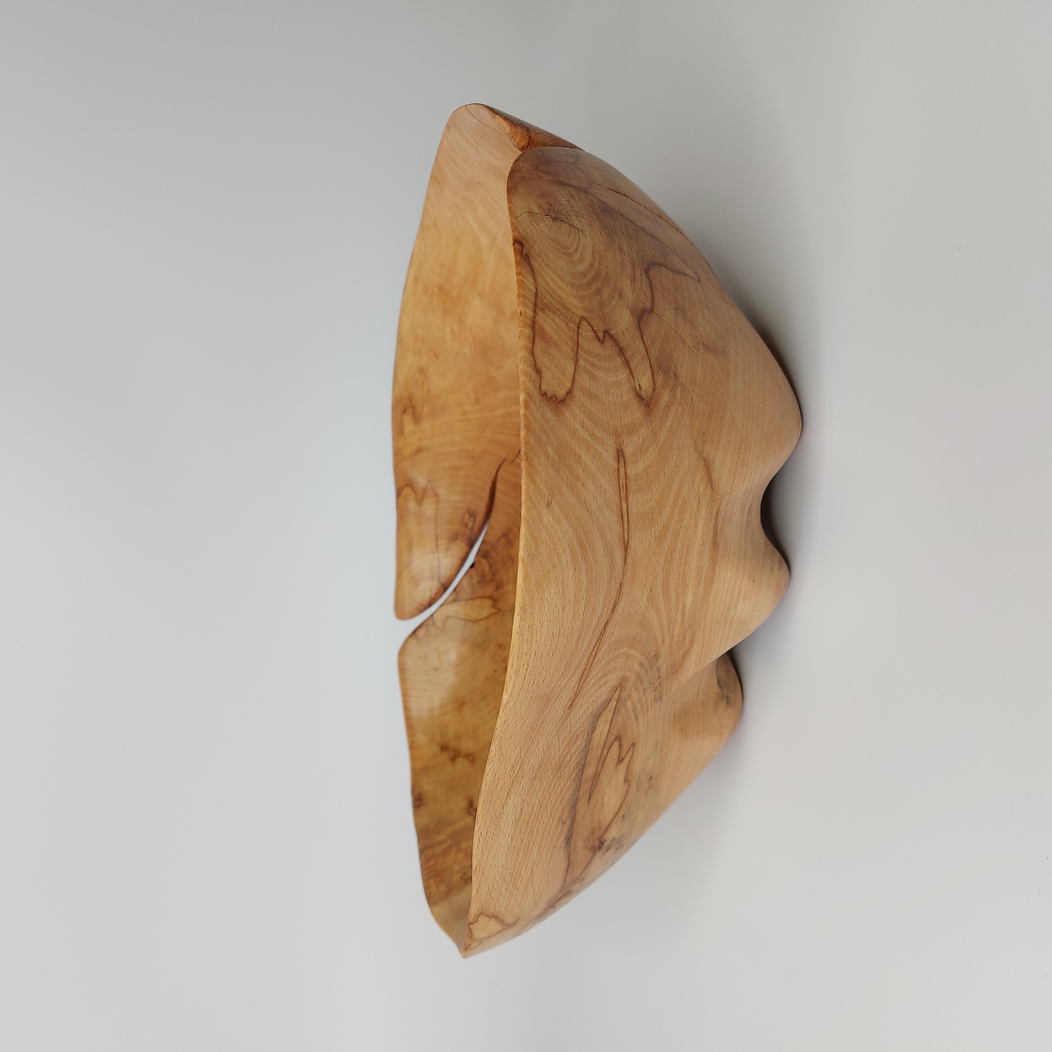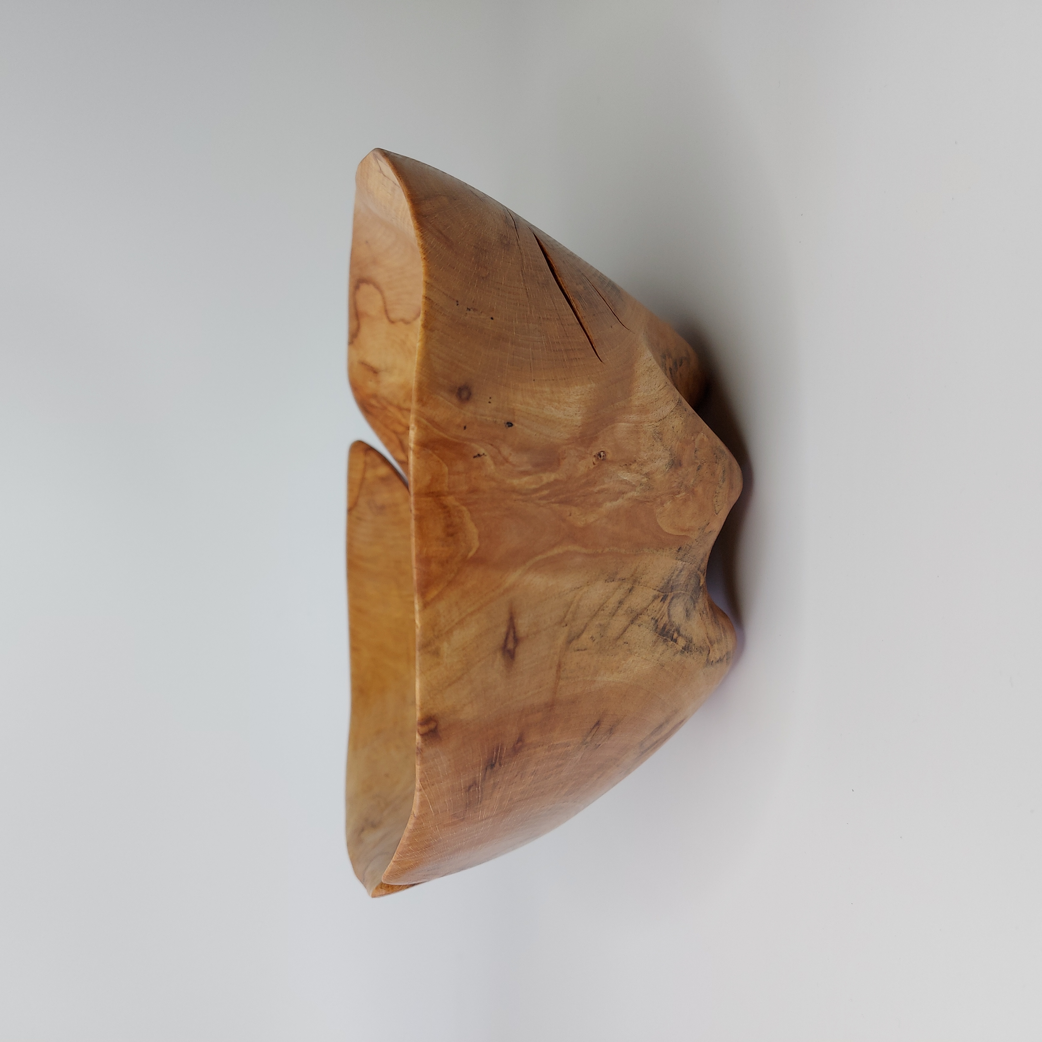 Dlabaná mísa z nalezeného starého odřezku po kácení v lese. Na hotové míse je patrné poškození dřeva způsobené dlouhým působením vlhkosti. Při vysychání nahrubo vydlabané mísy došlo k výraznému praskání, které ve výsledku dodalo míse zajímavý vzhled doplněný výraznými mapami na dřevě.